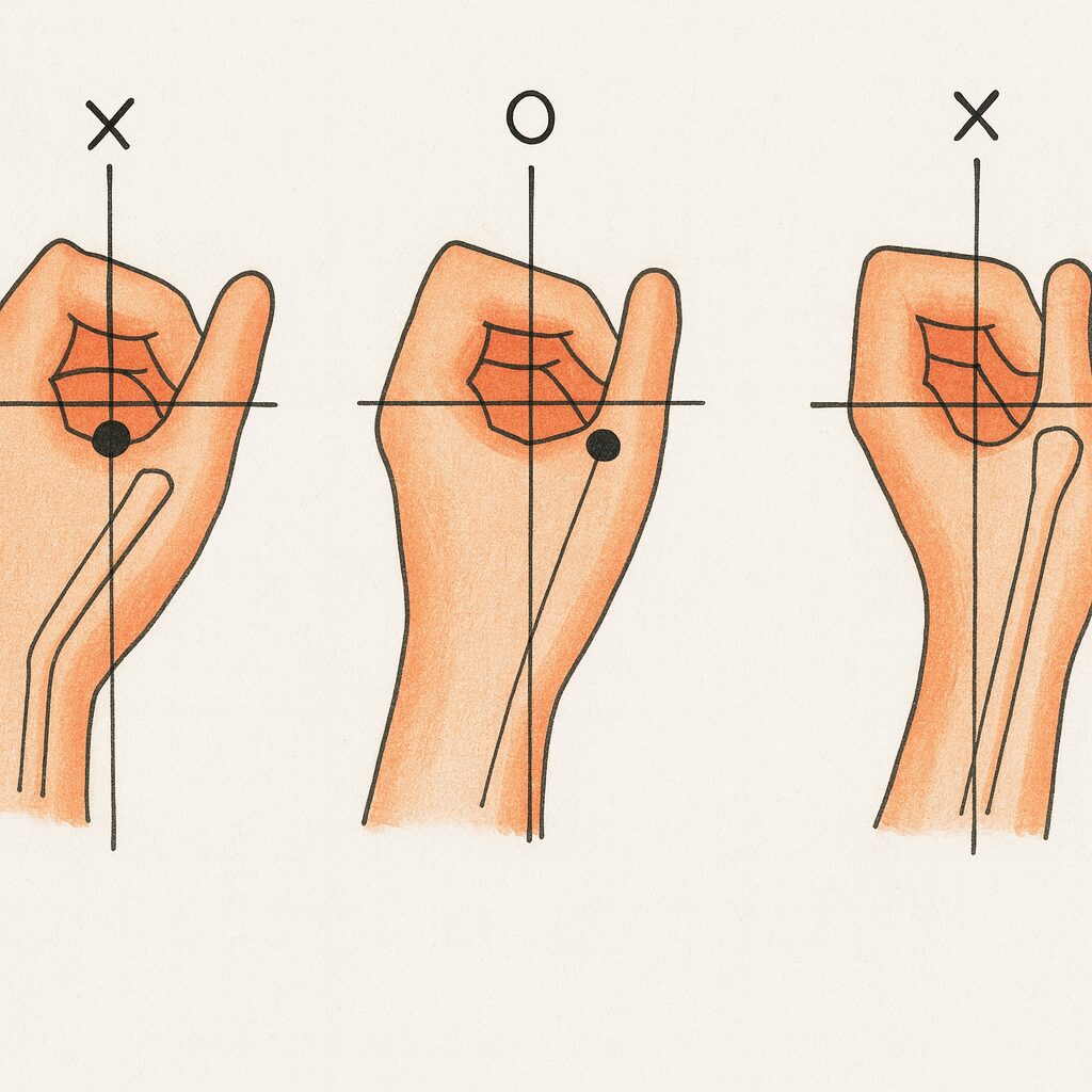 親指の配置は、手の内の接面とモーメント(回転を生む働き)を決定づける構成要素です。母指球で面を作る際、親指の根元(母指球)で握り側木と「面—面」で当たり、親指先端は早期に的へ向けず、母指球の面づくりの延長として自然に位置づけると、押圧の合力が手根部を通りやすくなります。親指の爪が常に外方向や極端な上向きになっている場合、接面が点圧化し、離れ直前の滑りが増加して手首の背屈や回内・回外の代償が起こりやすくなります。反対に、親指を過度に内へ巻き込み、母指球の面が潰れると、押圧方向が小指側へ流れて手関節の尺側偏位(小指側へ曲がる動き)を誘発することがあります。