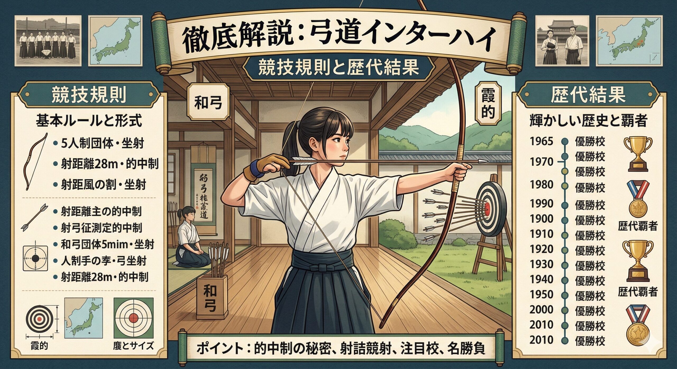 インターハイを100%楽しむためには、独特のルールや近年の勢力図を知っておくのが一番です。ここでは、ただ「中てる」だけではない弓道の奥深さを解説します。